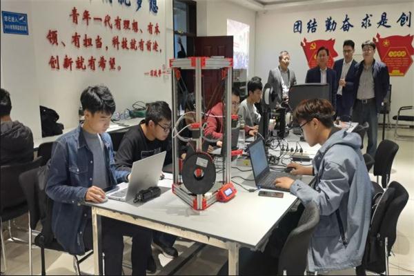 与会嘉宾与备战“高教杯”全国老员工先进成图技术与产品信息建模创新大赛的机电队员进行交流,队员们现场演示比赛的3D打印环节,与会领导寄语他们增强信心,努力提高,争取在国赛中取得优异成绩。