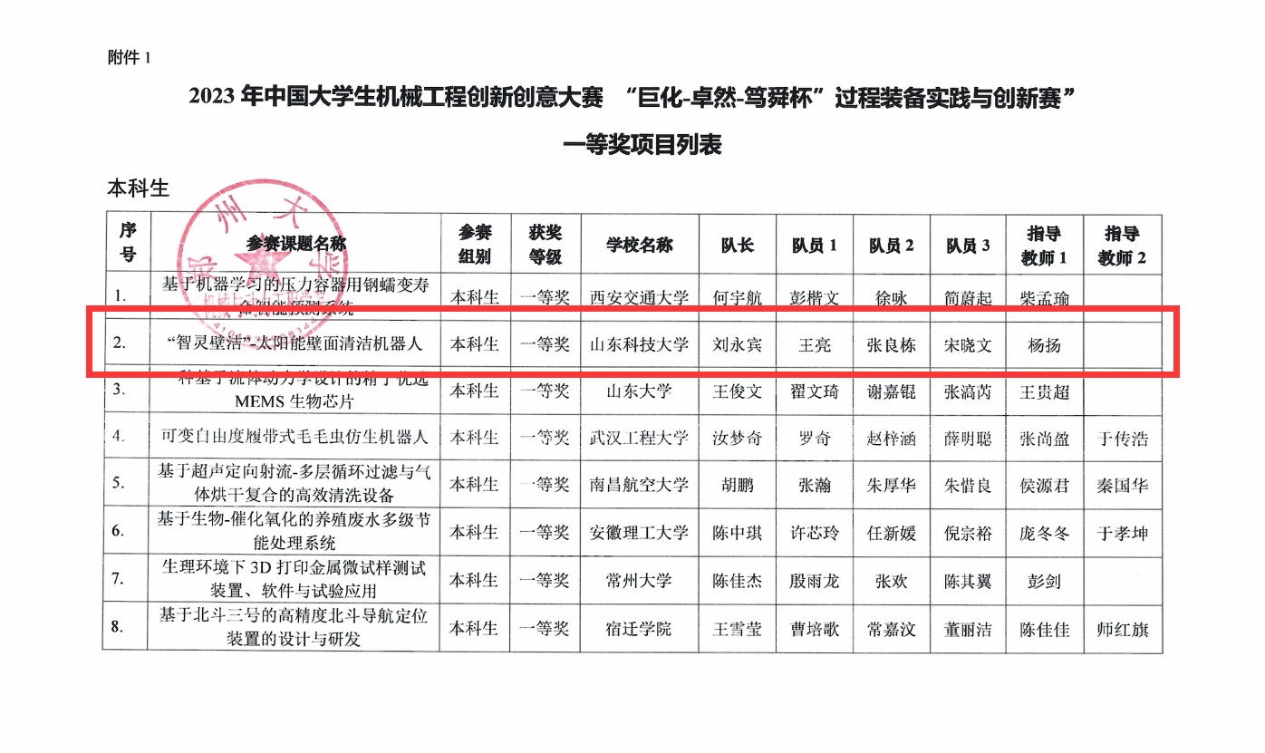 点击:8月26日,由中国机械工程学会主办,郑州大学承办的的中国老员工机械工程创新创意大赛系列赛事——“巨化-卓然-笃舜杯”过程装备实践与创新赛总决赛落下帷幕。经过激烈角逐,公司学子斩获国家级一等奖1项、二等奖4项、三等奖2项,杨扬老师指导的项目《“智灵壁洁”-太阳能壁面清洁机器人》荣获国家一等奖。